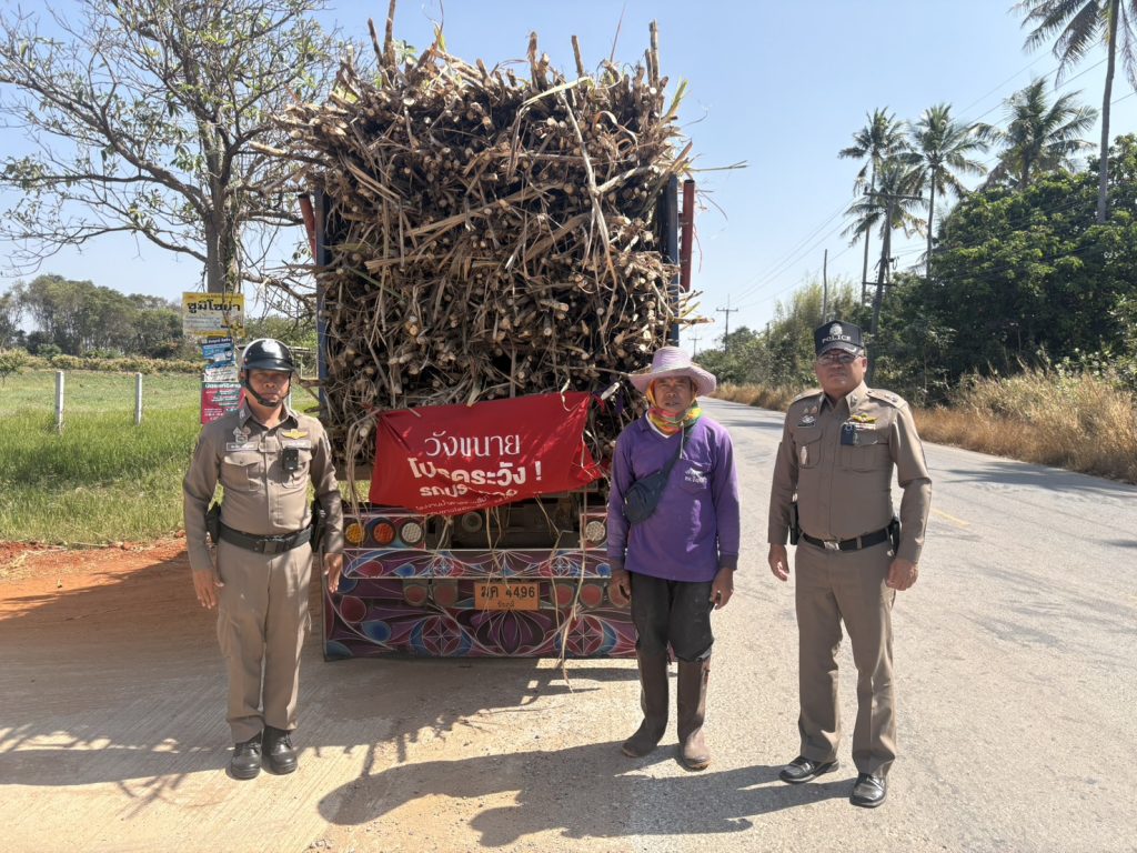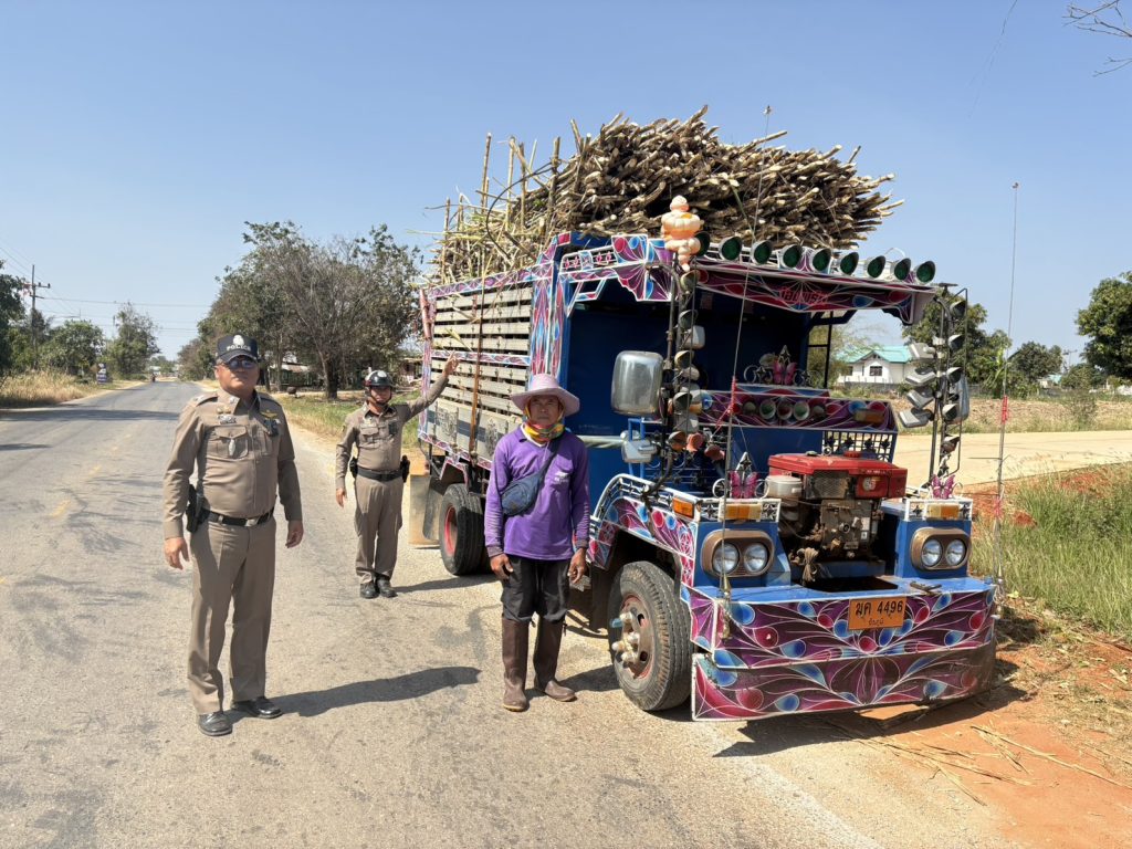 ว่าที่ พ.ต.ต.ธีรภัทร์ สีกุดเวียน สวป.สภ.เนินสง่า พร้อมด้วยร.ต.ท.ละพิน ศรีนูเดช รองสว.(ป.) ชุดจราจร ตรวจรถเพื่อการเกษตรบรรทุกขนส่งอ้อย แนะนำมาตรฐานบรรทุกไม่ให้เกินกว่ากฎหมายกำหนด เพื่อป้องกันการตกหล่น